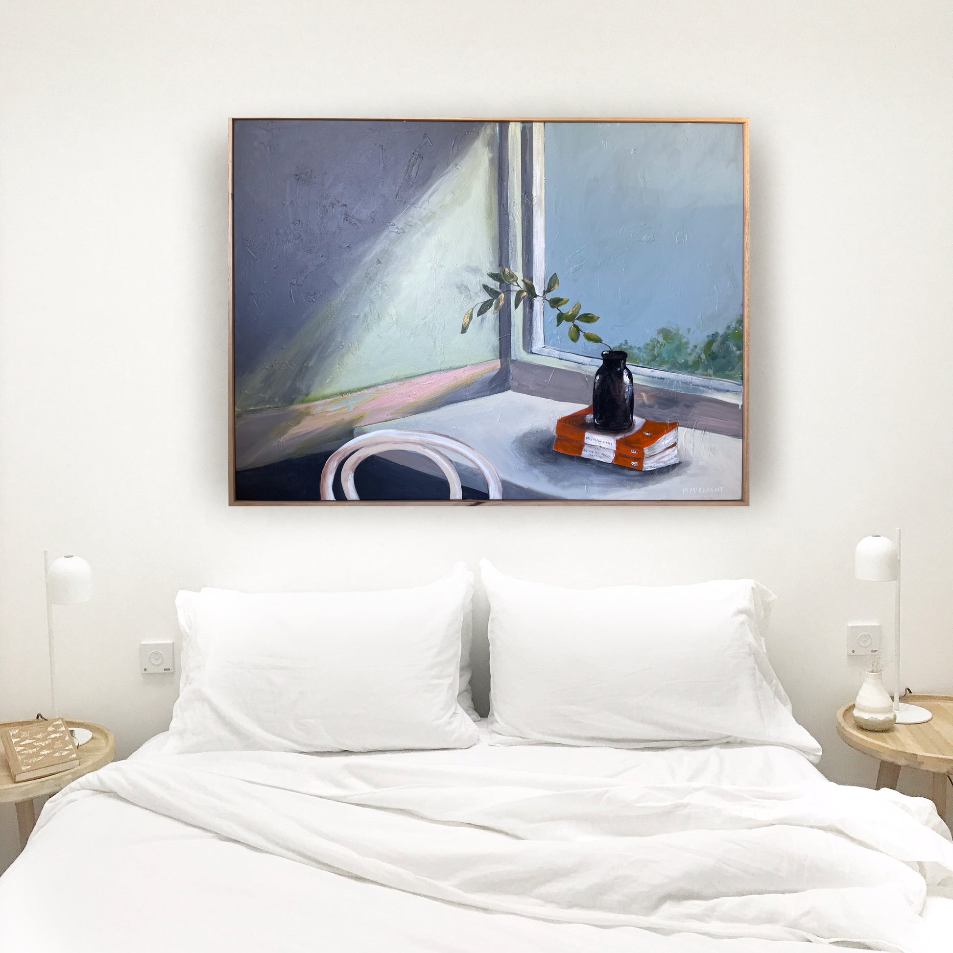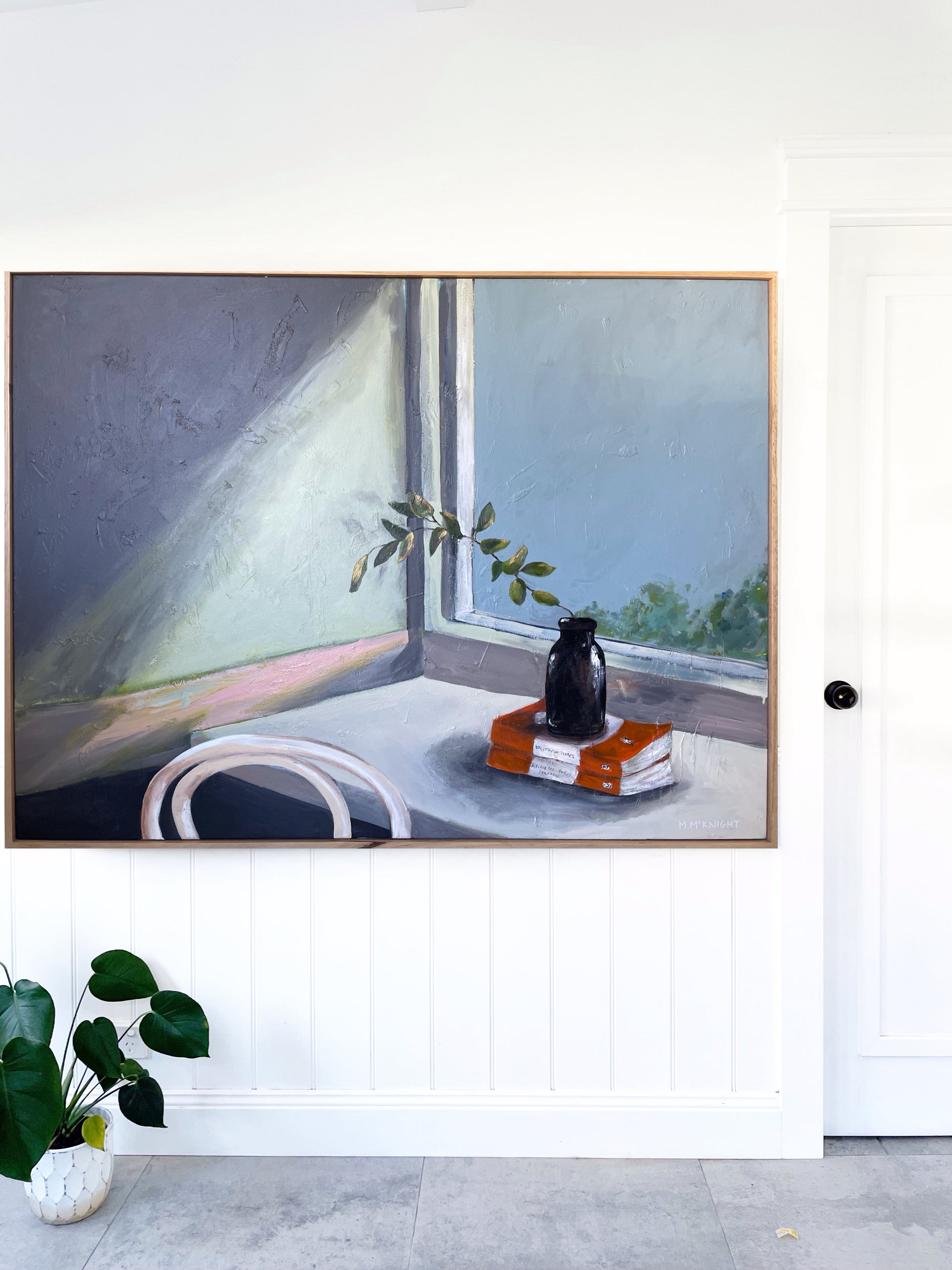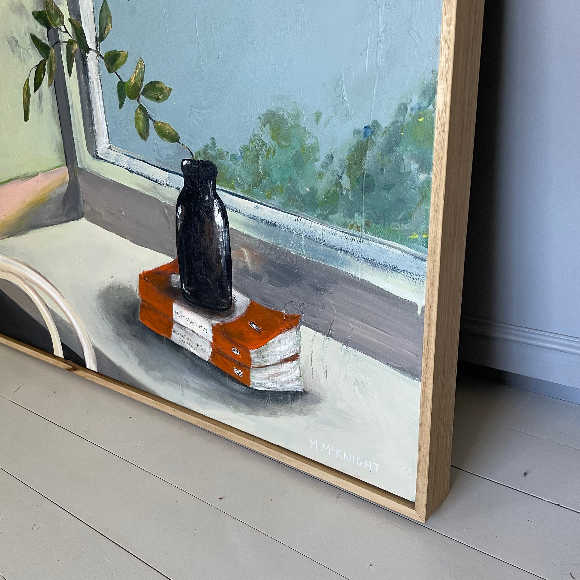 McKnight’s beautiful still life painting captures a vignette of books, a reclaimed vase and a few sprigs of gum tree, taken from her own Sydney garden. Inspired by vintage artwork, she has toned down her usual colour palette in this piece, letting the nostalgia and love of literature shine through and take centre stage.