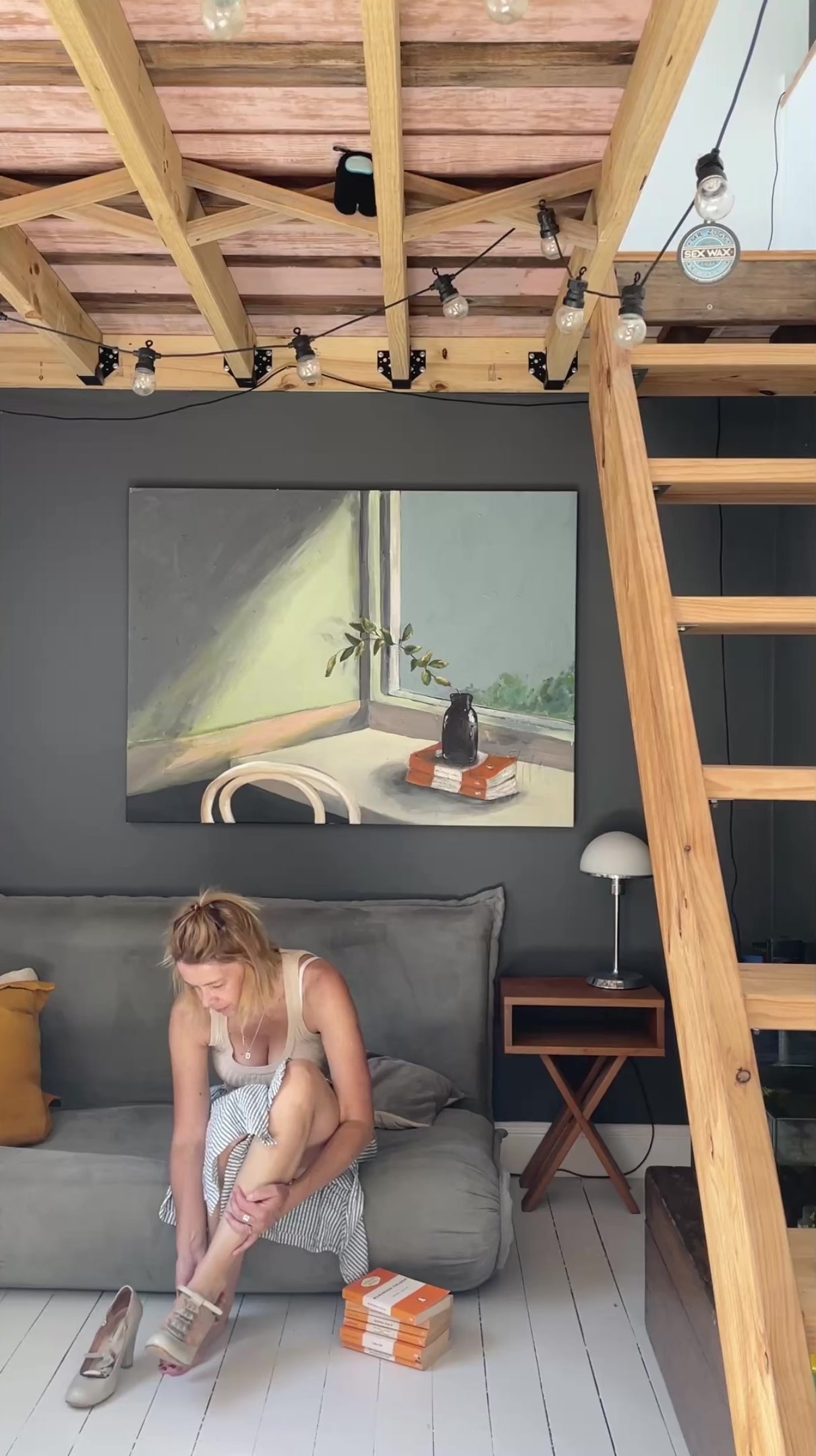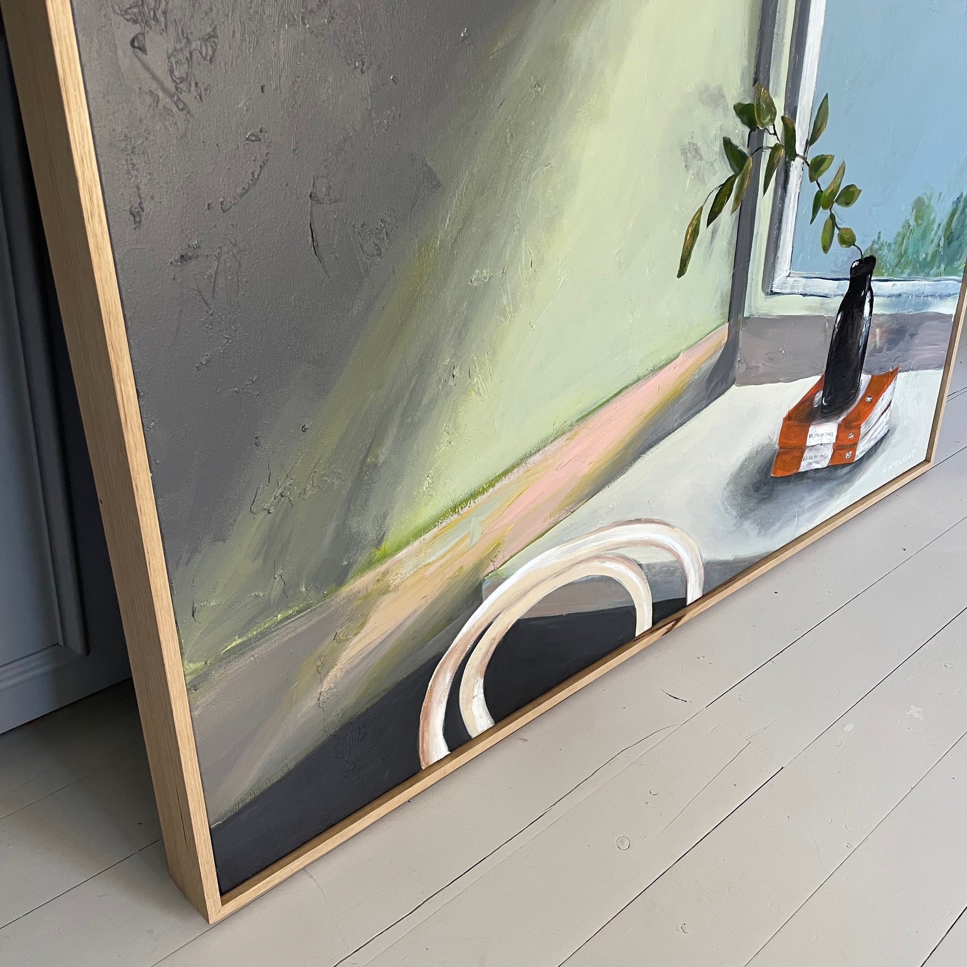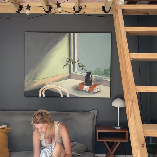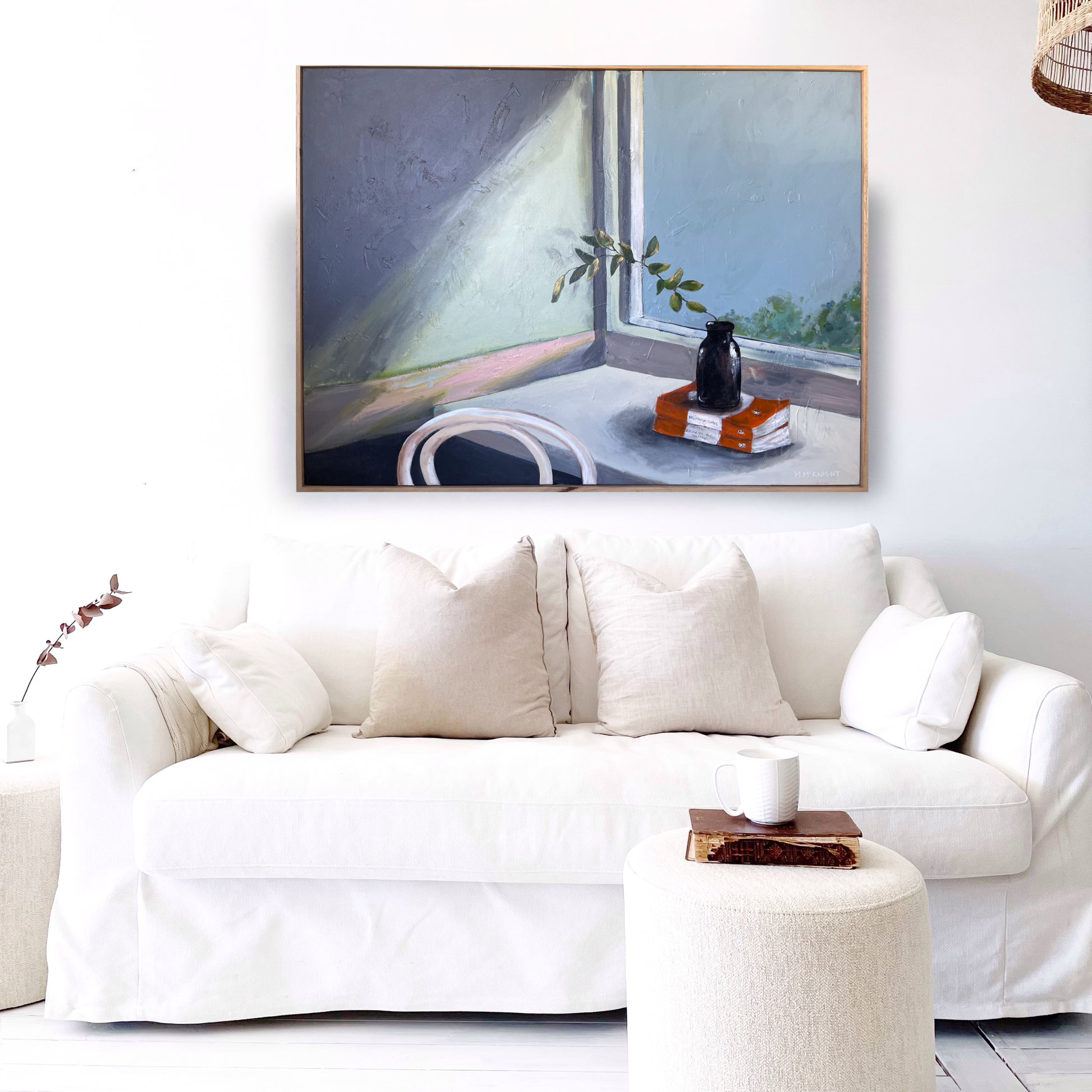 McKnight’s beautiful still life painting captures a vignette of books, a reclaimed vase and a few sprigs of gum tree, taken from her own Sydney garden. Inspired by vintage artwork, she has toned down her usual colour palette in this piece, letting the nostalgia and love of literature shine through and take centre stage.