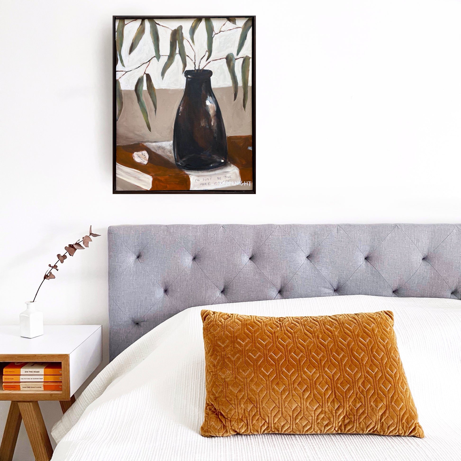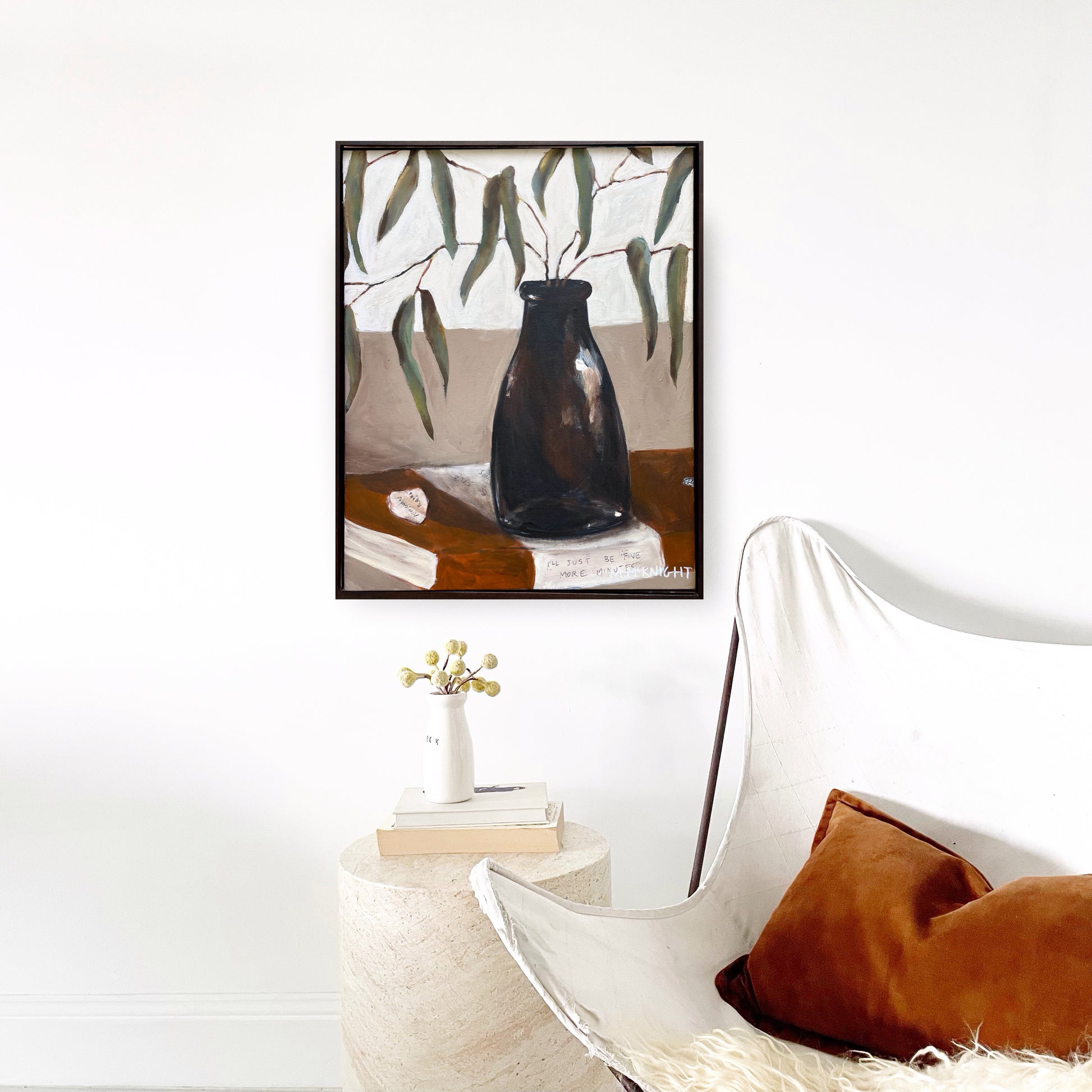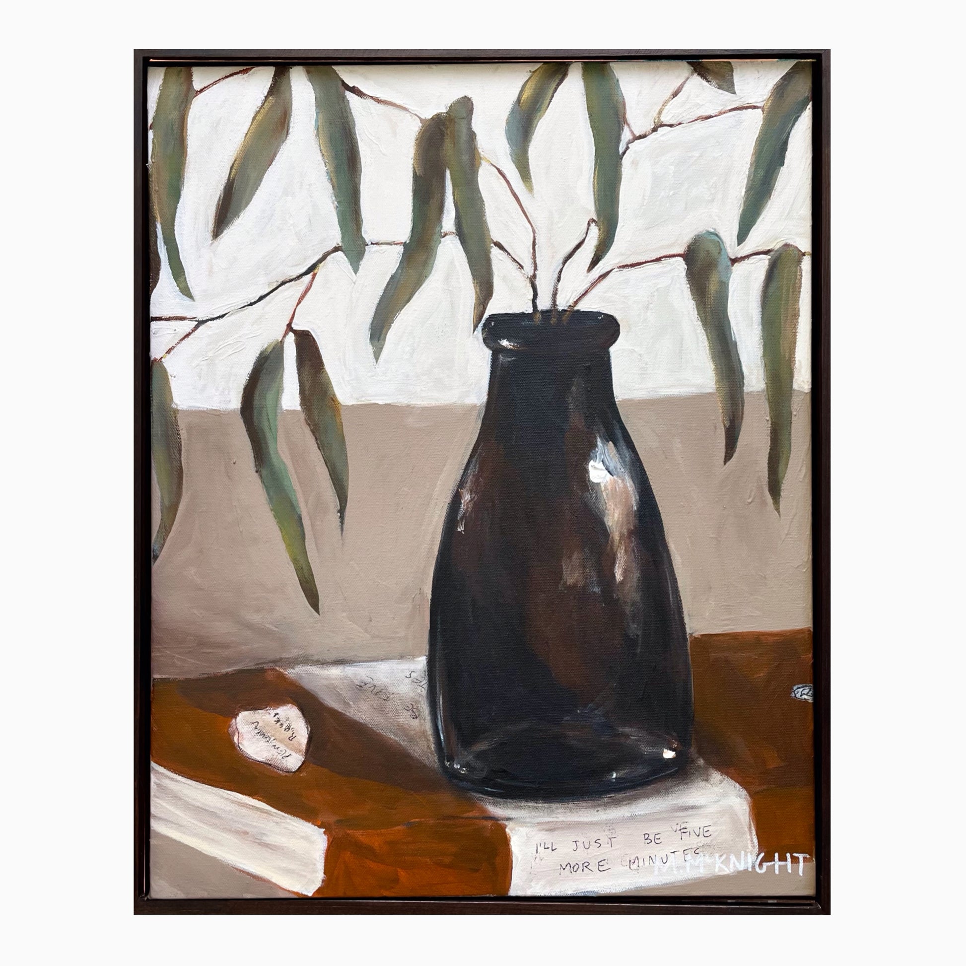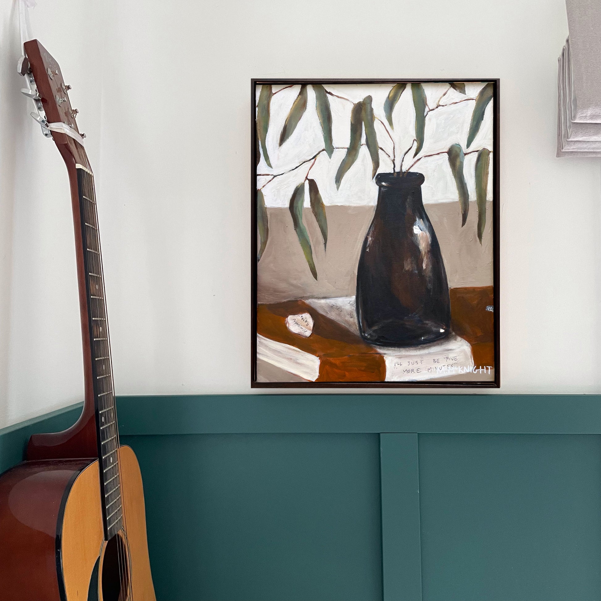 McKnight’s beautiful still life painting captures a vignette of books, a reclaimed vase and a few sprigs of gum tree, taken from her own Sydney garden. Inspired by vintage artwork, she has toned down her usual colour palette in this piece, letting the nostalgia and love of literature shine through and take centre stage.