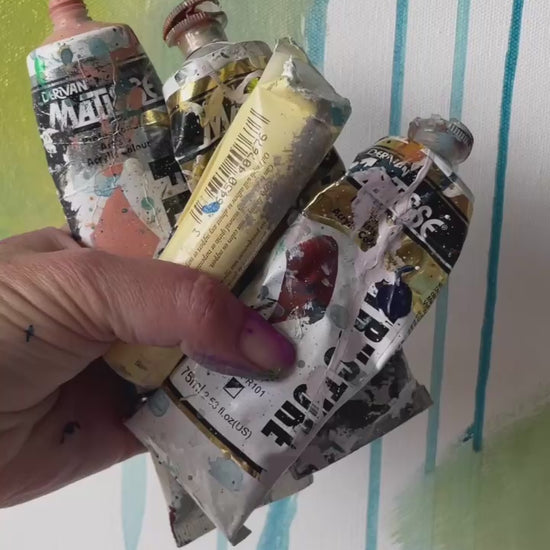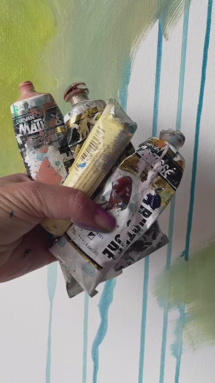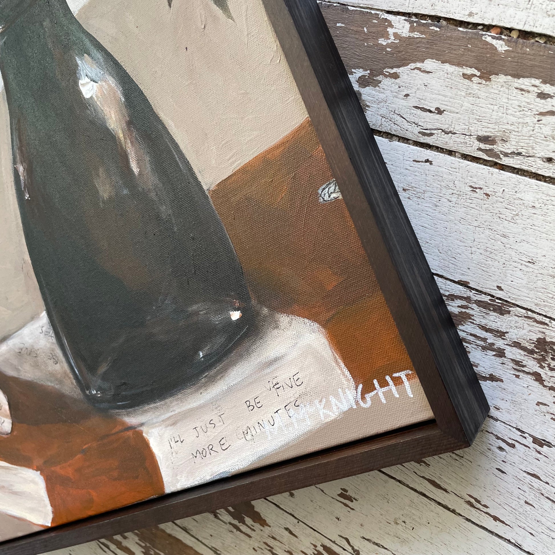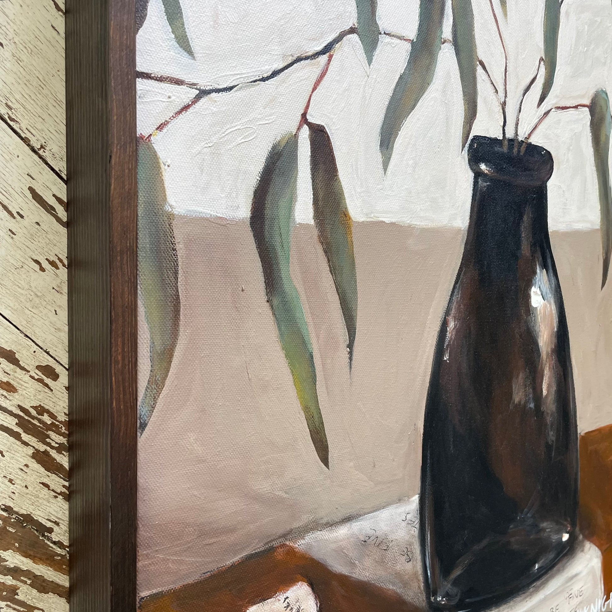 McKnight’s beautiful still life painting captures a vignette of books, a reclaimed vase and a few sprigs of gum tree, taken from her own Sydney garden. Inspired by vintage artwork, she has toned down her usual colour palette in this piece, letting the nostalgia and love of literature shine through and take centre stage.