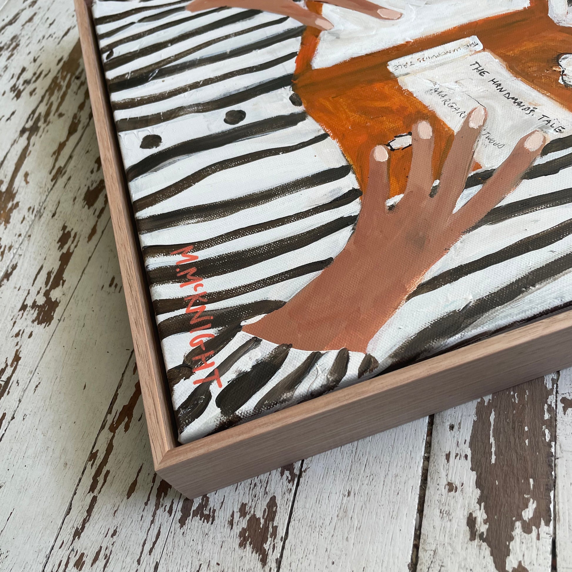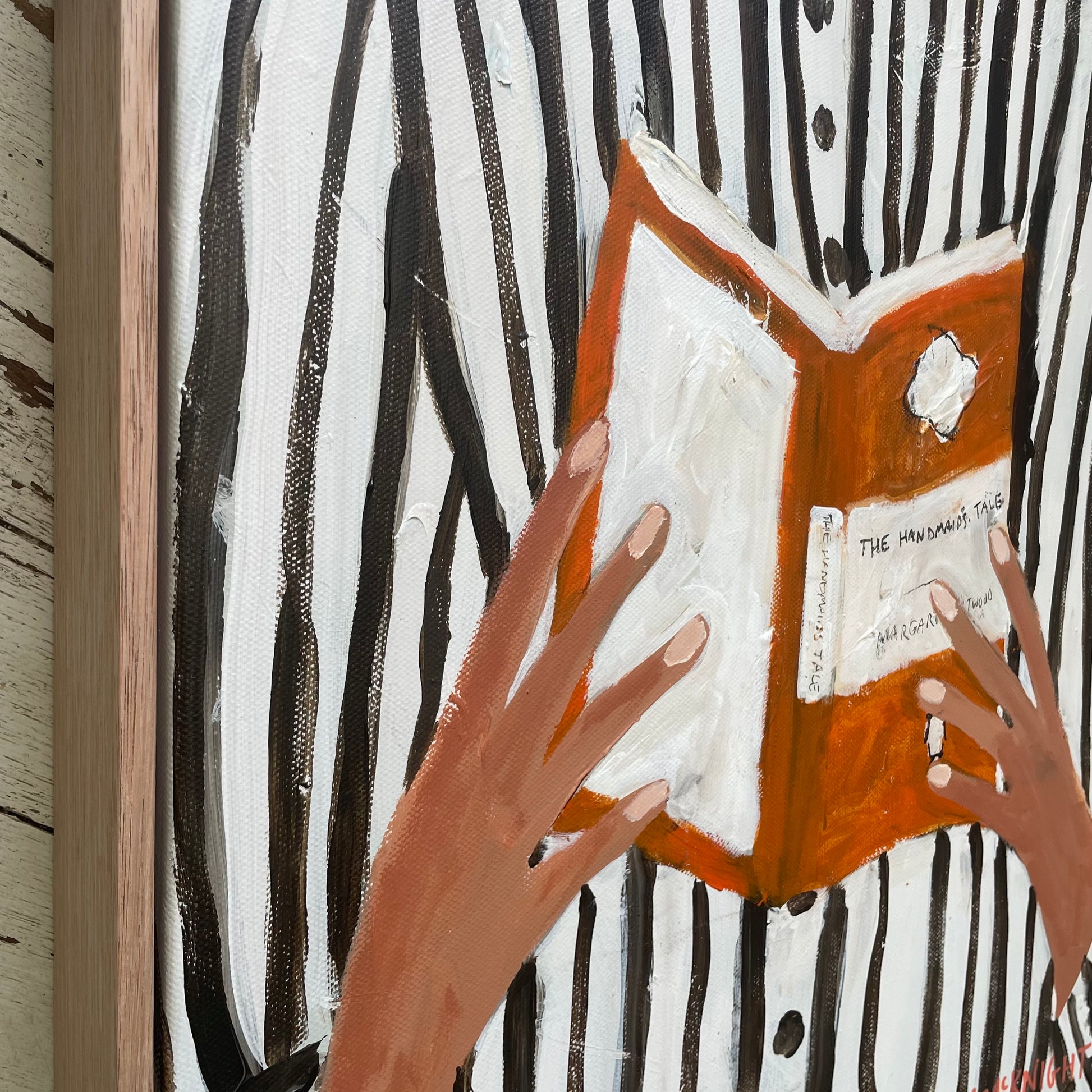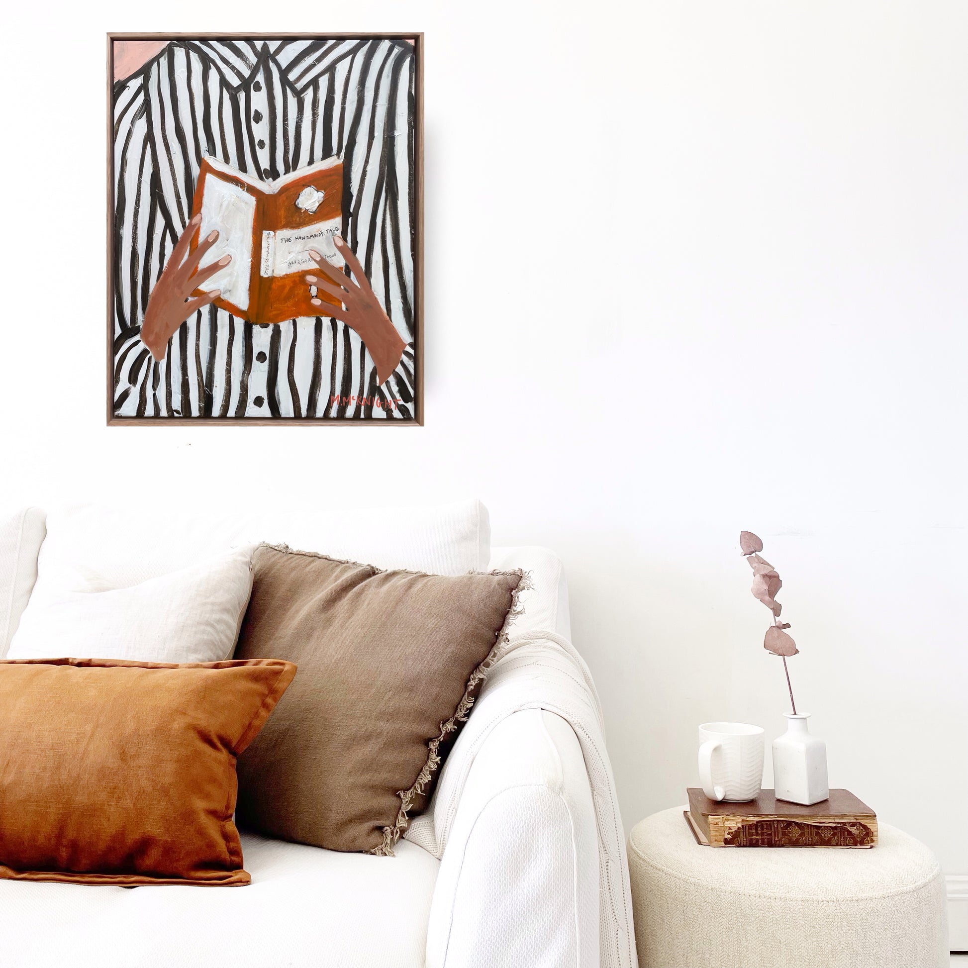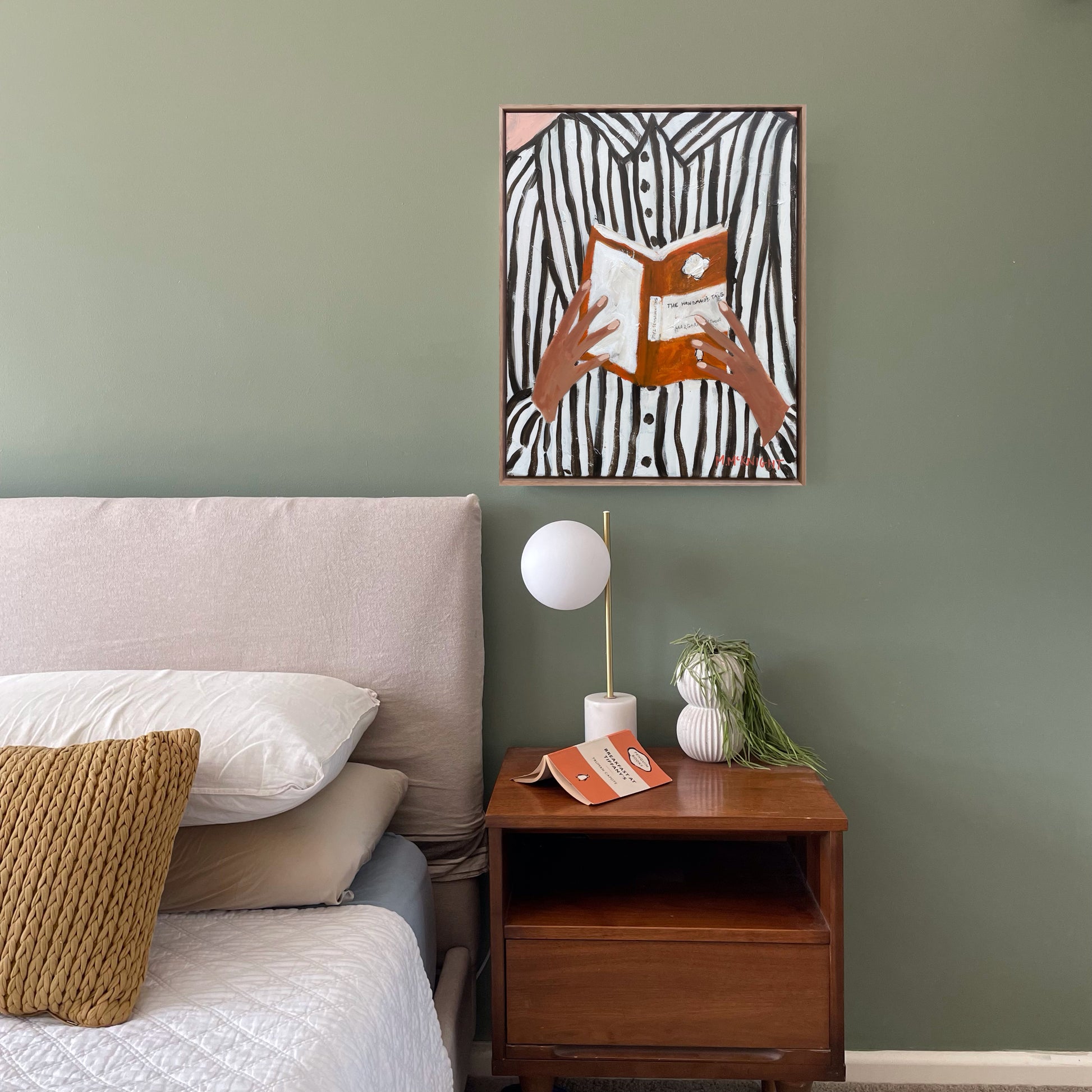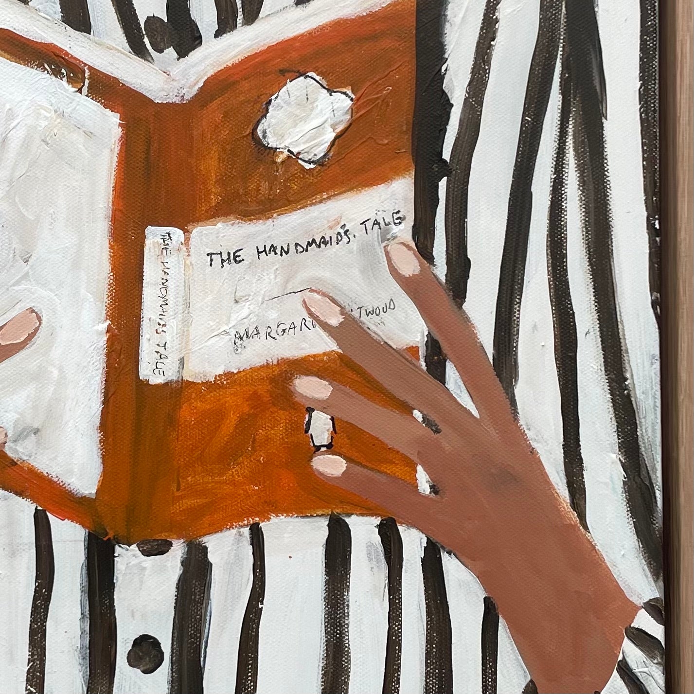 With a nod to vintage fashion and Renaissance-inspired poses, the layered brushwork on clothing and walls reflects the depth of the stories being told, while botanical patterns evoke a sense of wonder, hinting at adventures beyond the pages. Featuring Penguin classics with their iconic orange-and-white covers, some titles are clearly displayed while others remain hidden, inviting viewers to create their own narrative.