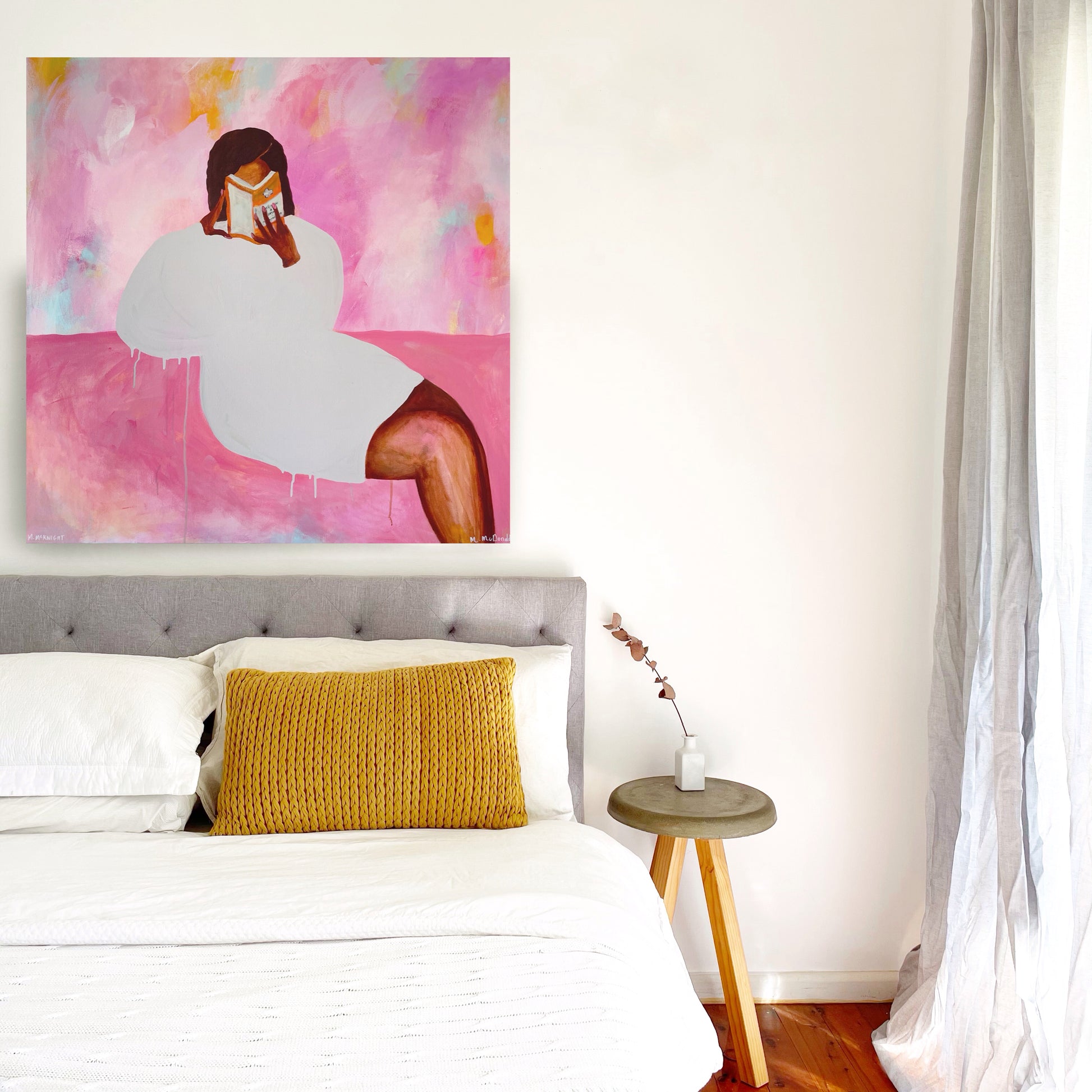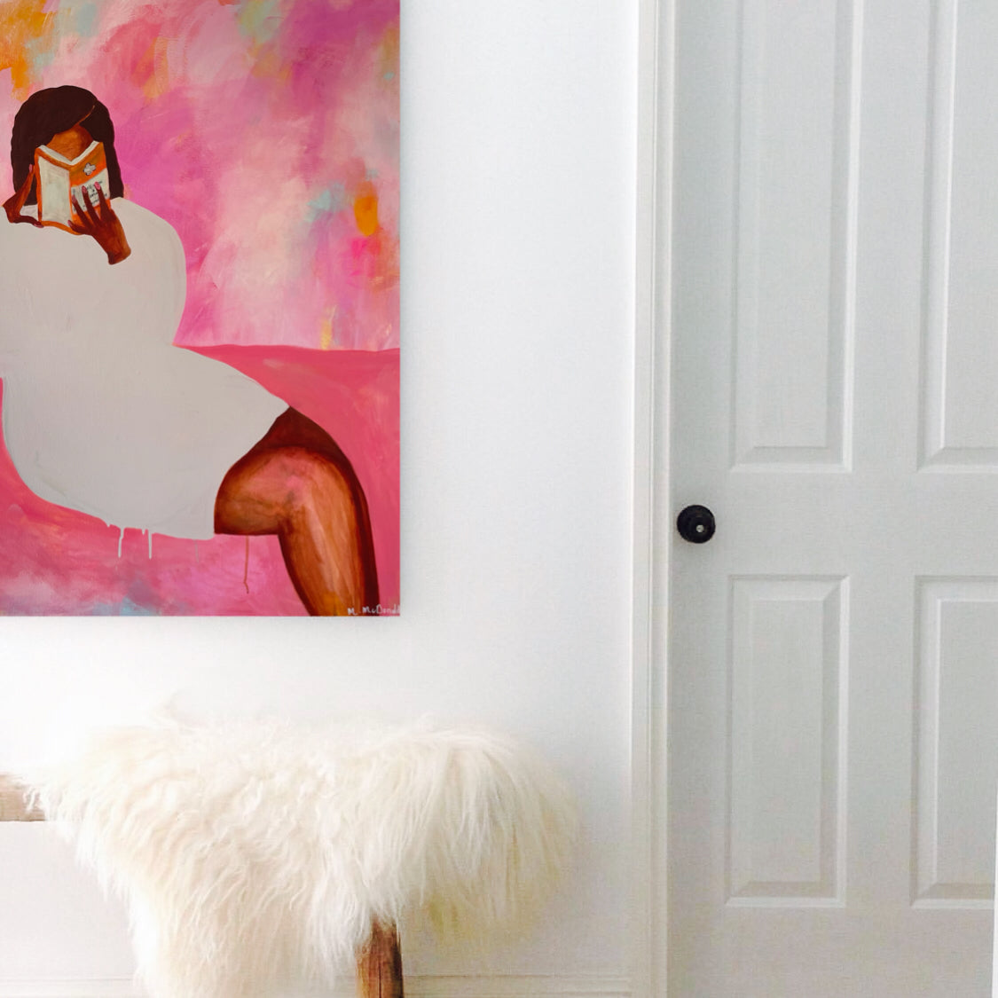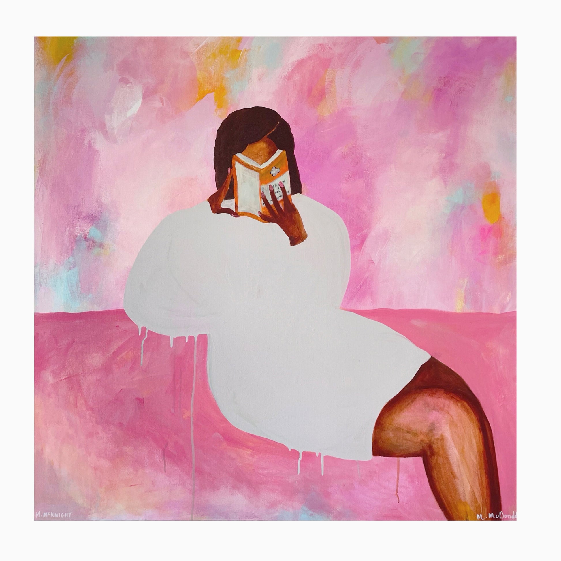 The gorgeous abstract background by McDonald infuses the piece with feelings of love, vulnerability and femininity, while the reclining figure painted by McKnight portrays a calm sensation of intelligence and peace with her place in the world.