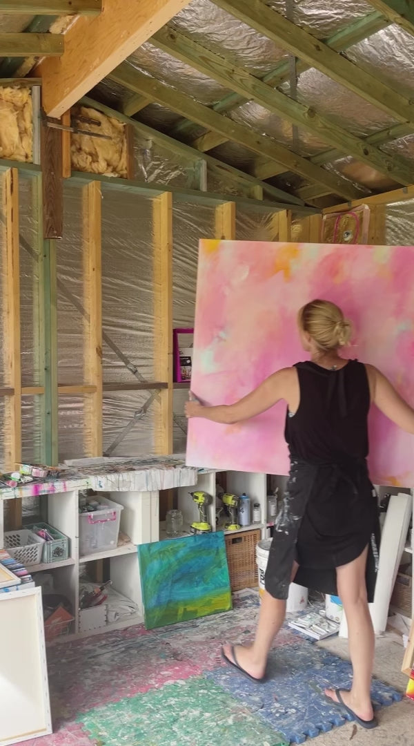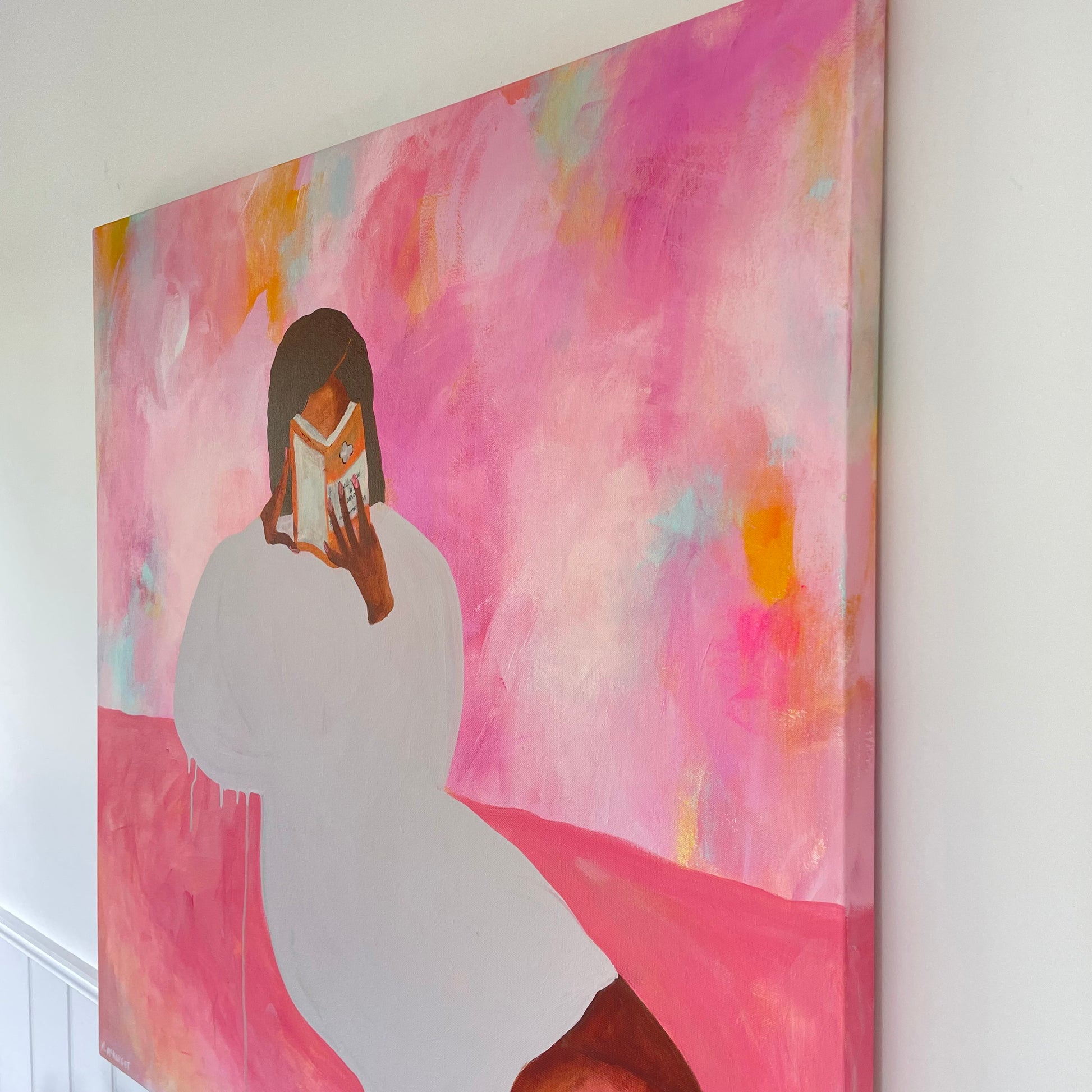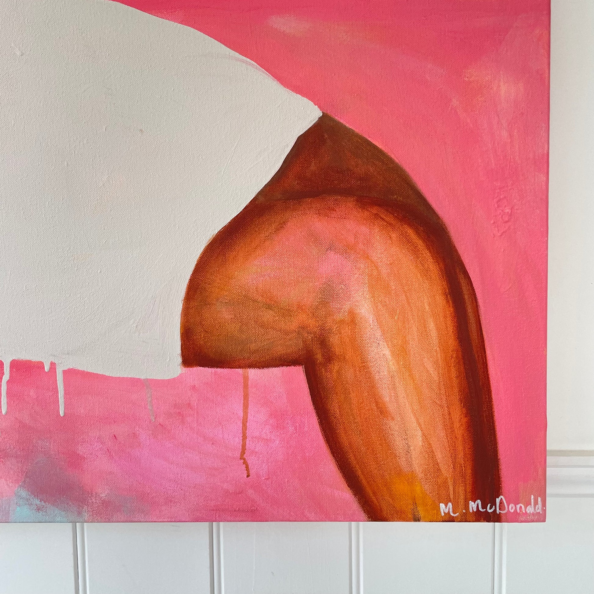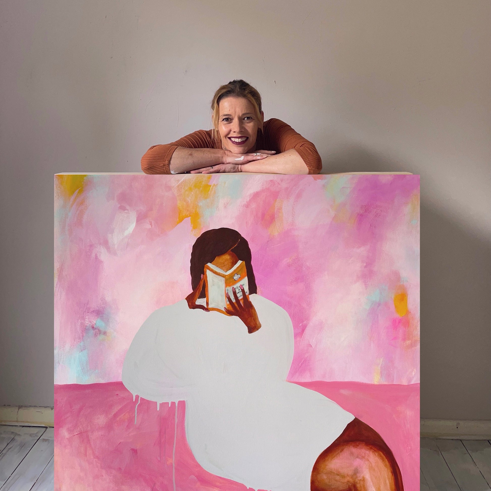 The gorgeous abstract background by McDonald infuses the piece with feelings of love, vulnerability and femininity, while the reclining figure painted by McKnight portrays a calm sensation of intelligence and peace with her place in the world.