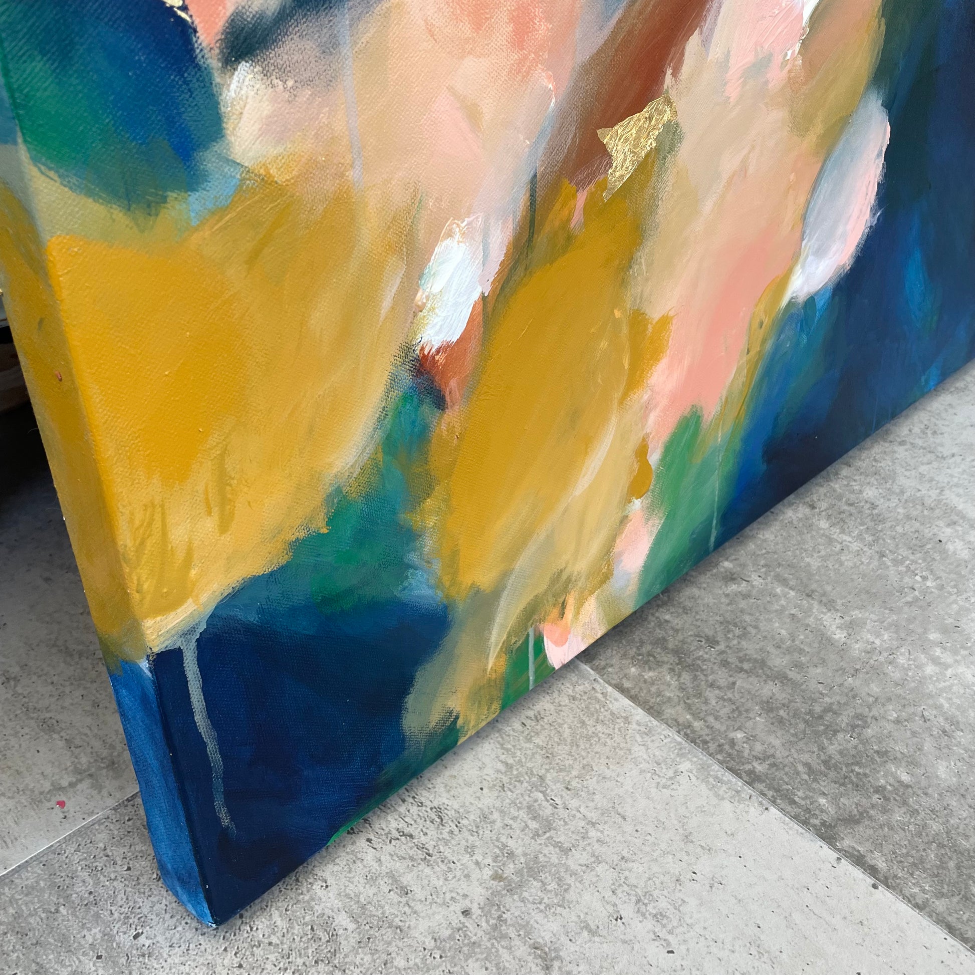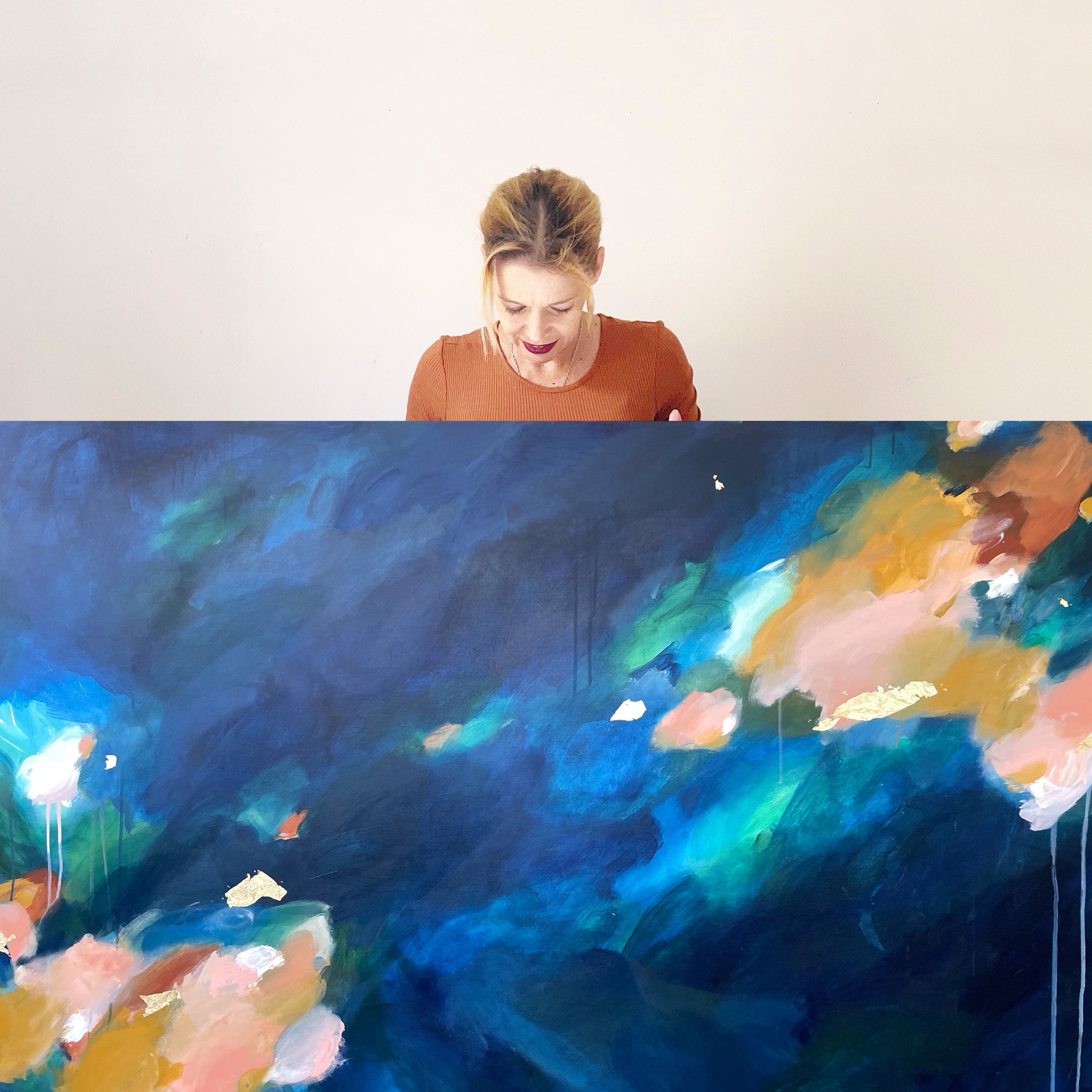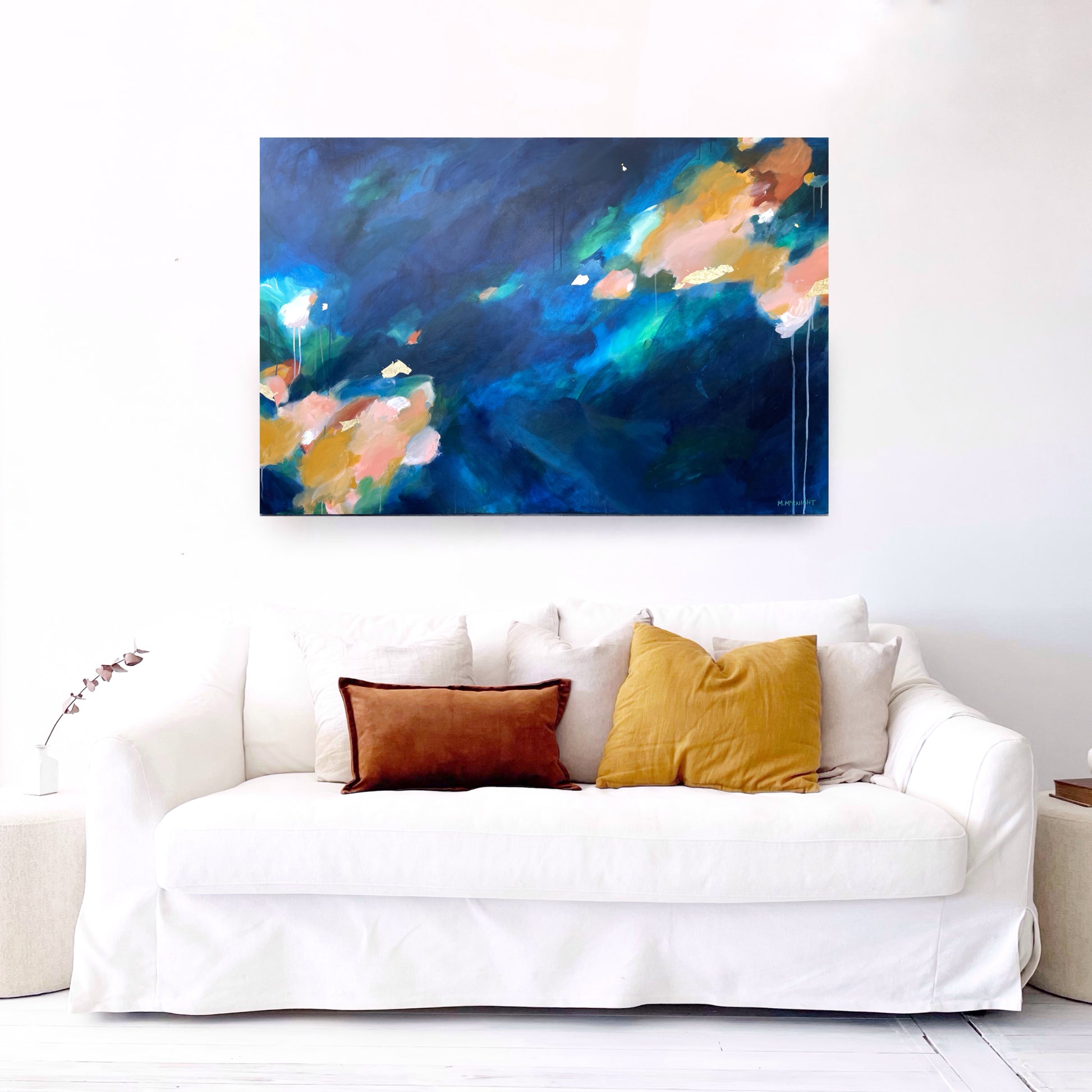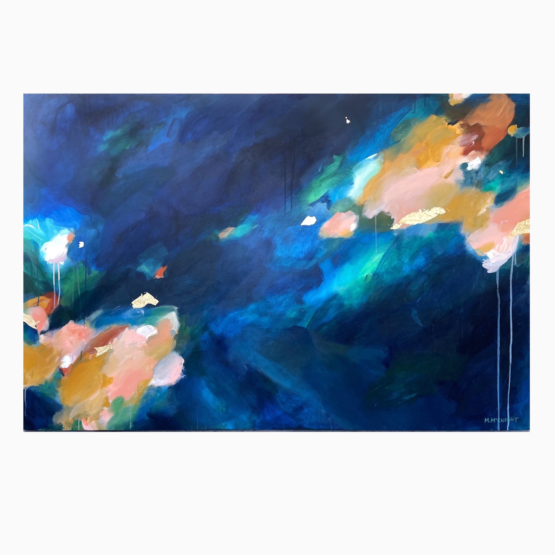 inspired by the interplay of light and water, this work is carefully crafted to capture fluidity and movement featuring intricate blends of mesmerising colour.