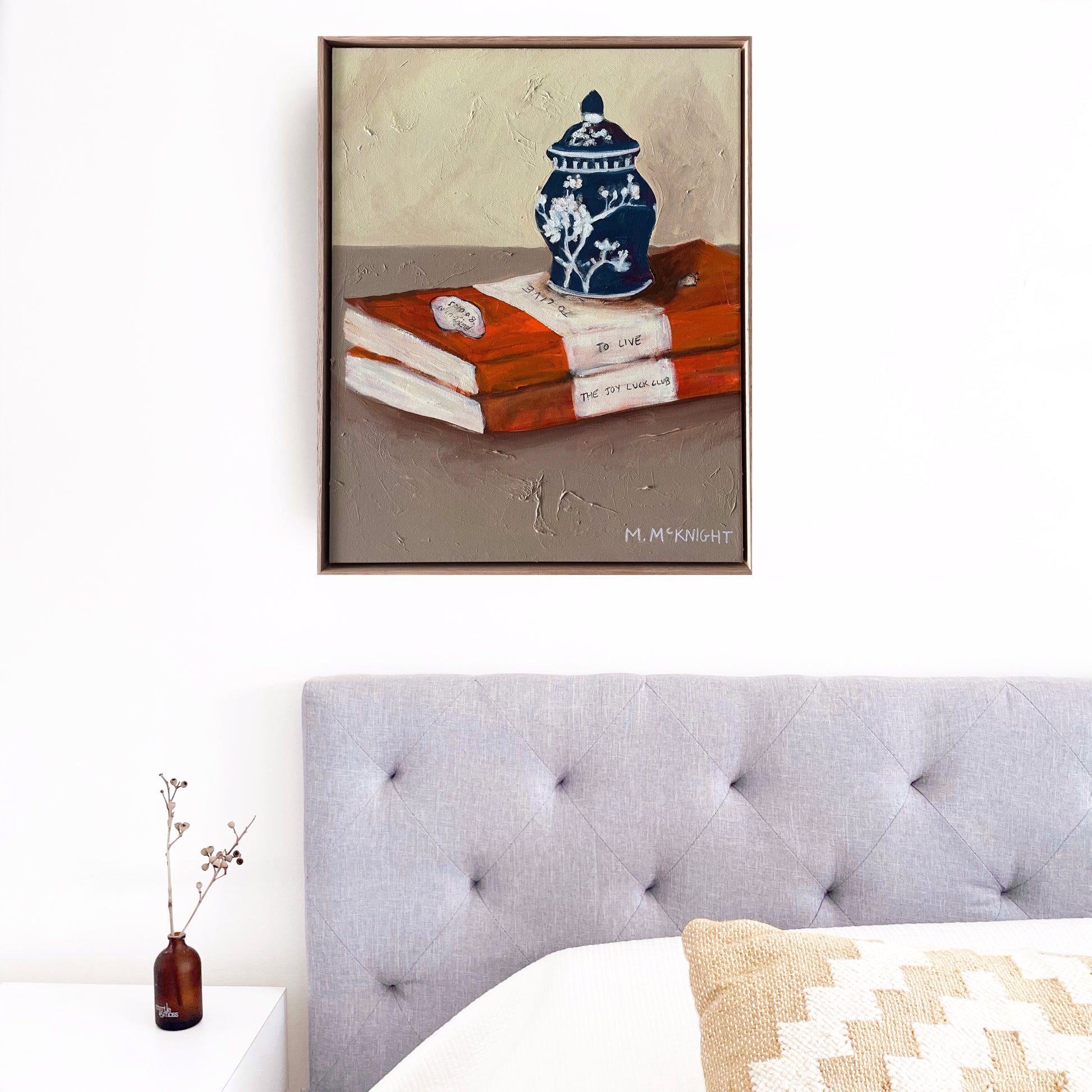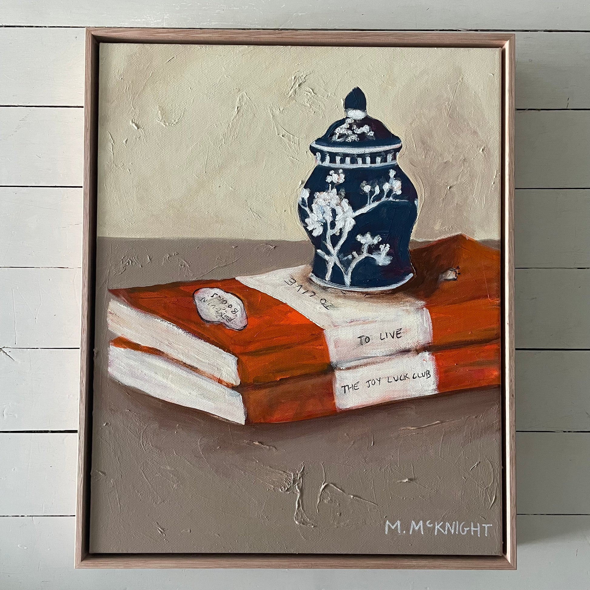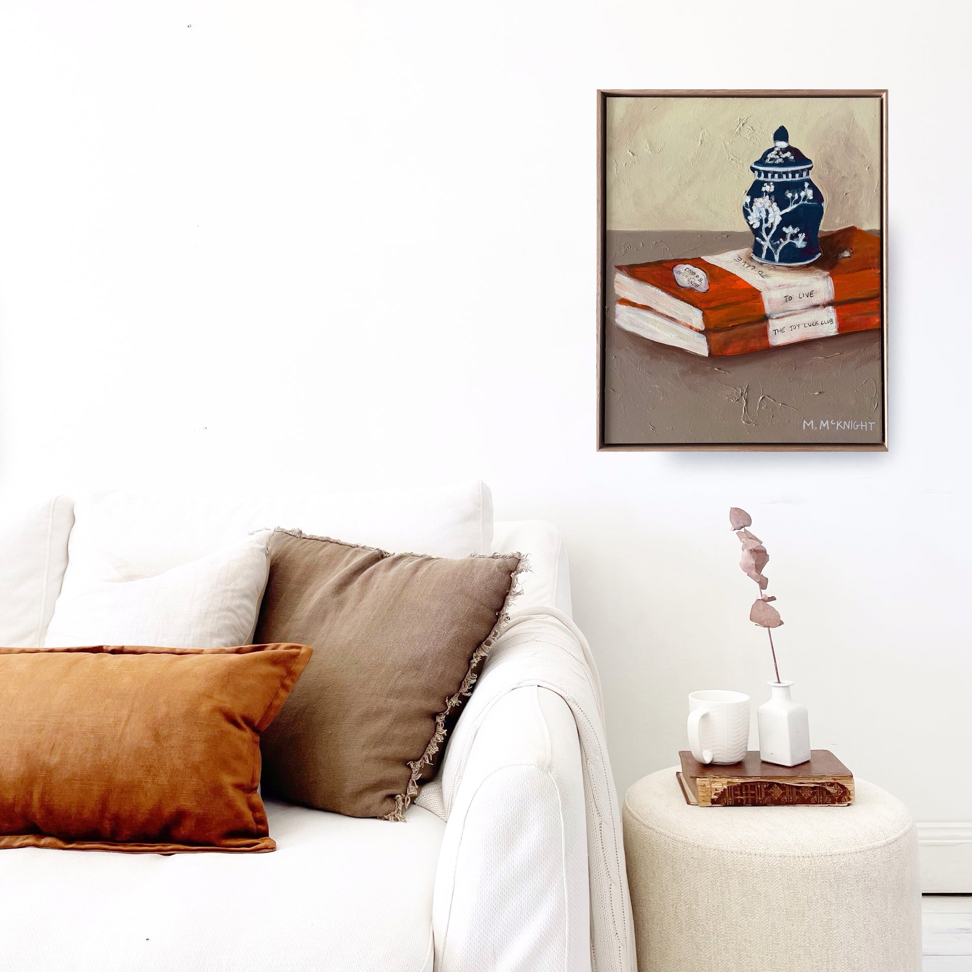 McKnight’s beautiful still life painting captures a vignette of books, a reclaimed vase and a few sprigs of gum tree, taken from her own Sydney garden. Inspired by vintage artwork, she has toned down her usual colour palette in this piece, letting the nostalgia and love of literature shine through and take centre stage.