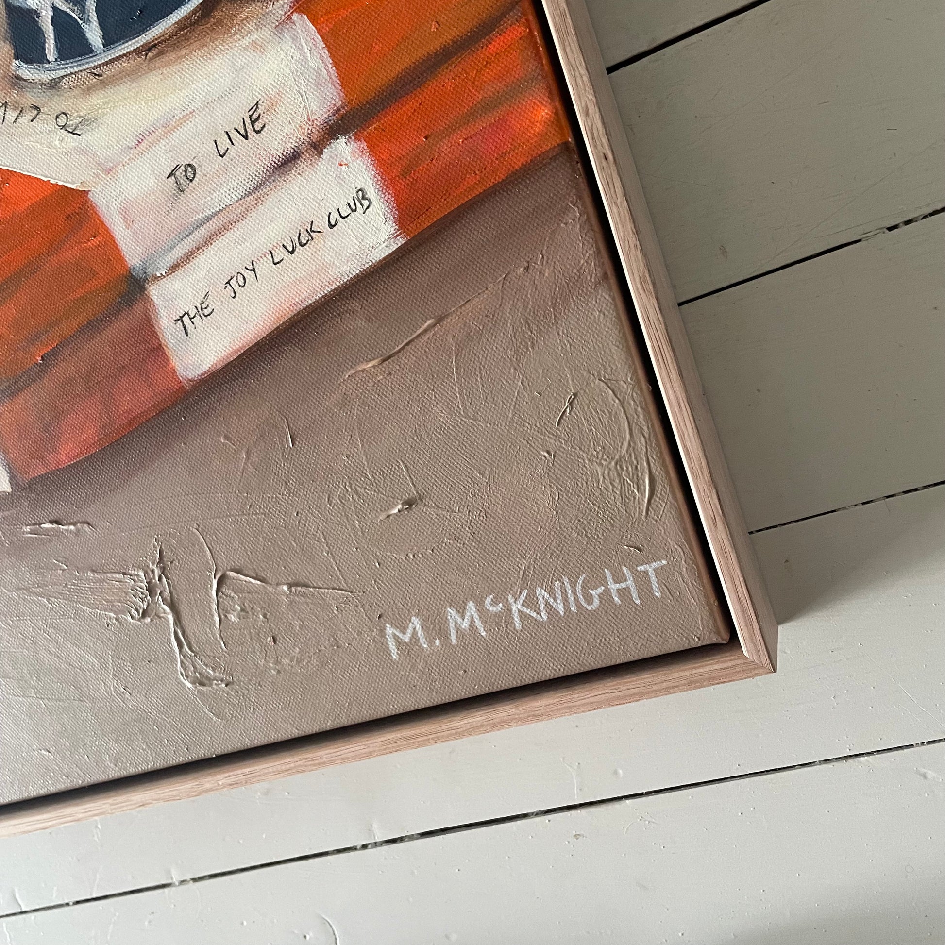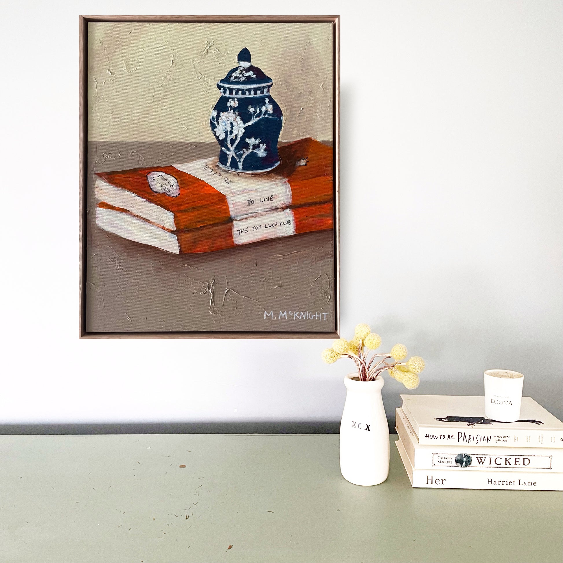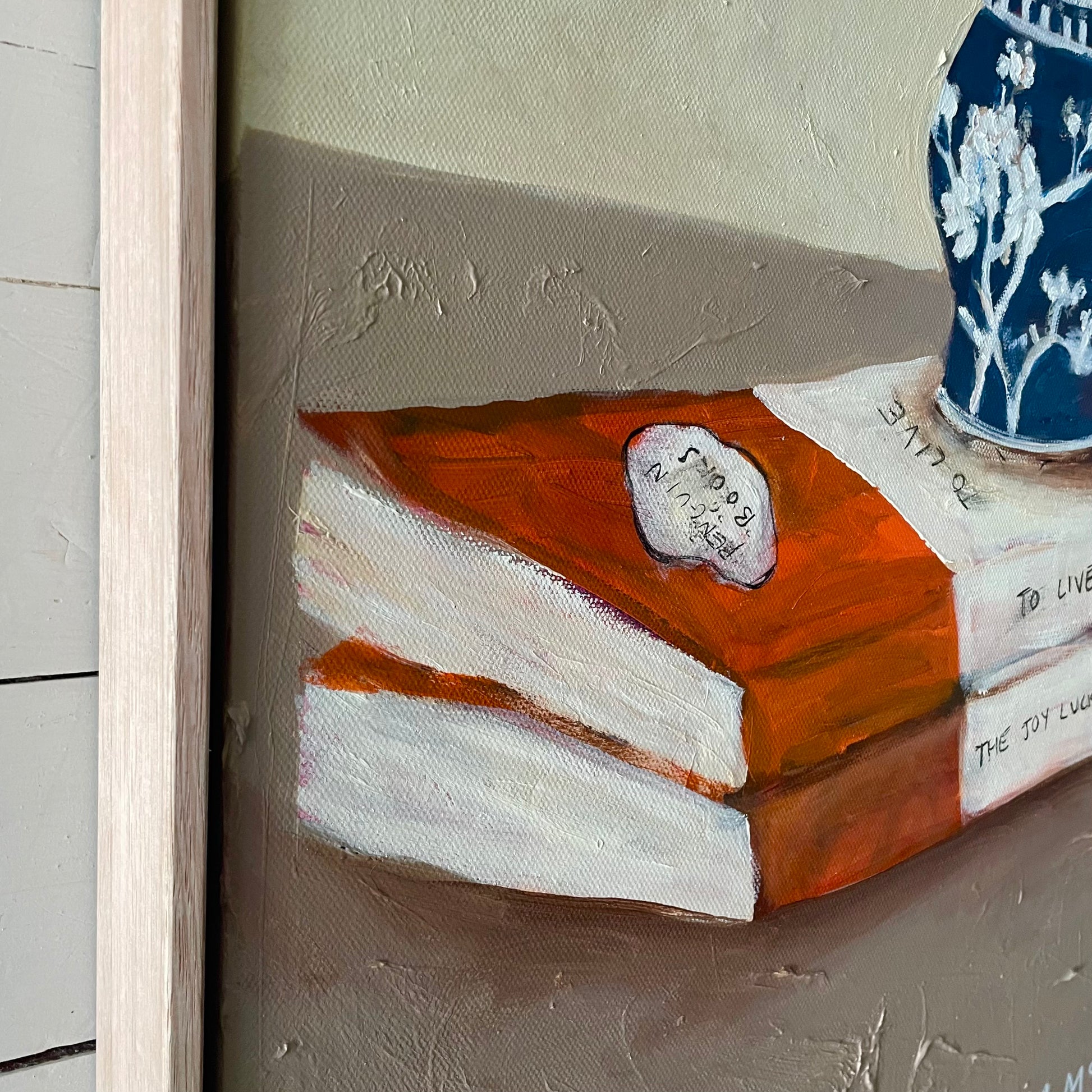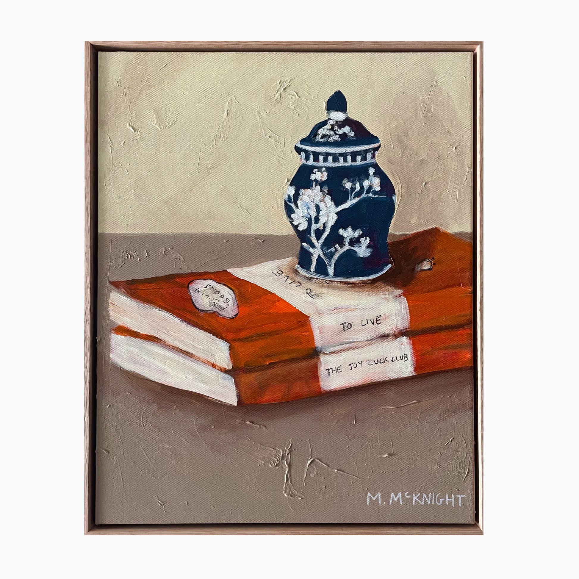 McKnight’s beautiful still life painting captures a vignette of books, a reclaimed vase and a few sprigs of gum tree, taken from her own Sydney garden. Inspired by vintage artwork, she has toned down her usual colour palette in this piece, letting the nostalgia and love of literature shine through and take centre stage.